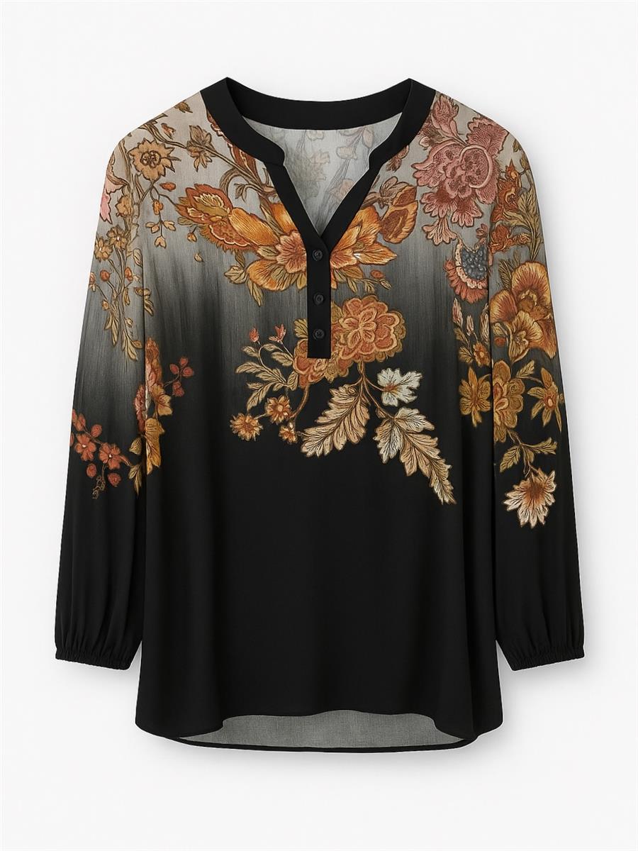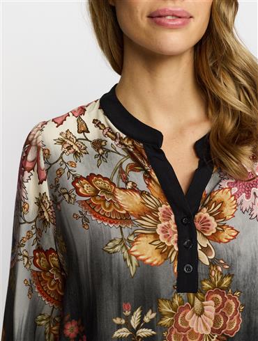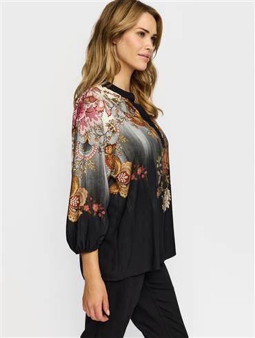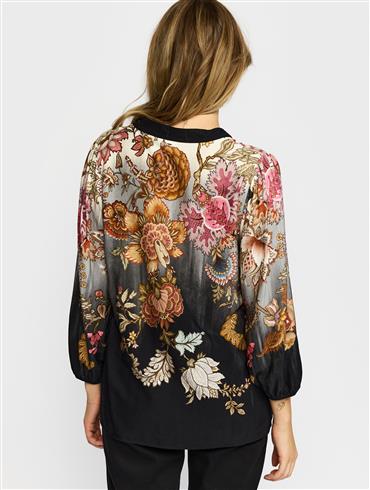 Blusen er i et smukt blomster print i brune/rosa og creme-farvet nuancer.