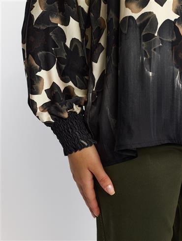 Blusen har lange ærmer med elastiksmock, rund halsudskæring, sort bånd ved halsudskæring og stolpe.