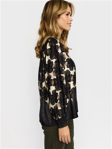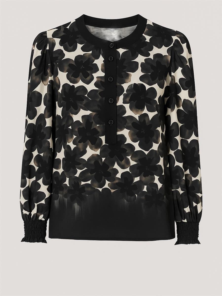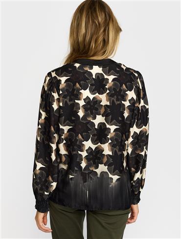 Elegant cremefarvet bluse fra 2-BIZ med flot blomster mønster i sorte og brune nuancer. Lækker blød kvalitet.