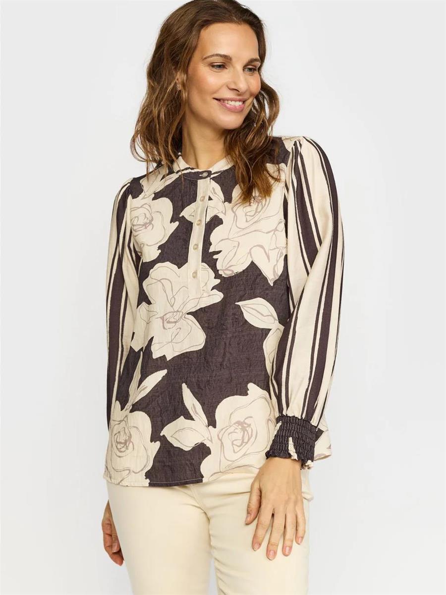 Bluse med lange ærmer, stolpelukning med knapper og rund halsudskæring. Blusen har to forskellige print, der er kombineret.