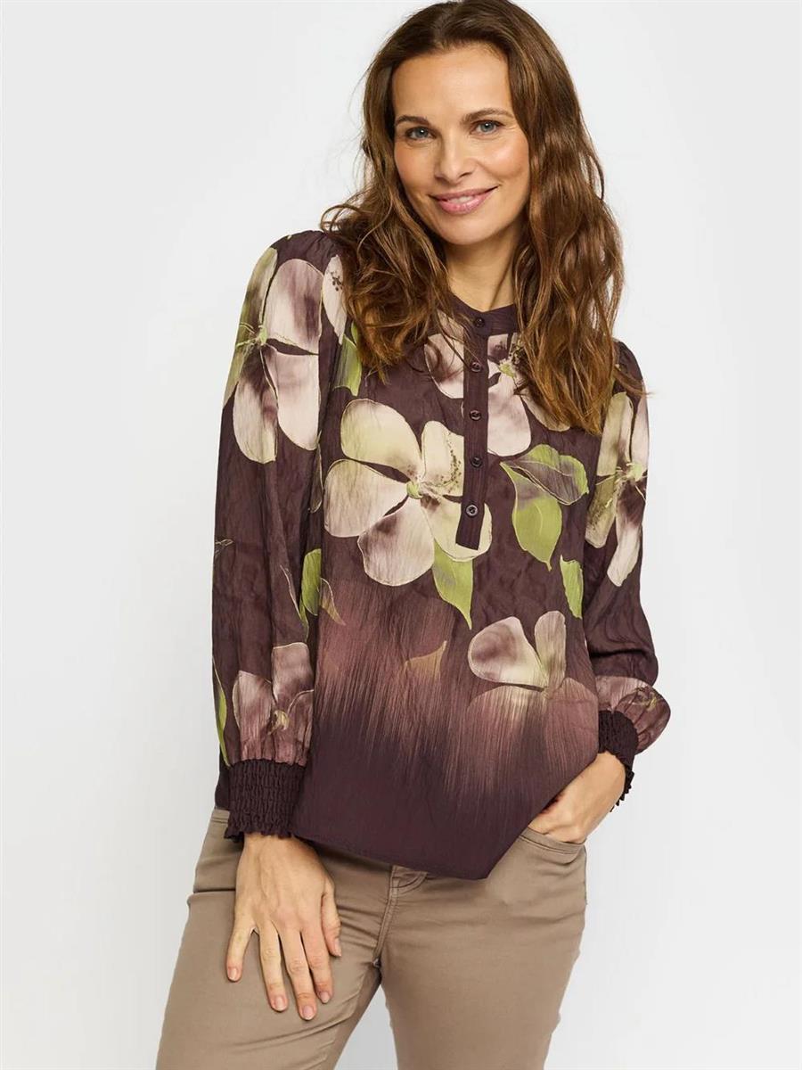 Bluse med lange ærmer og V-udskæring med stolpelukning og knapper i kontrastfarve.