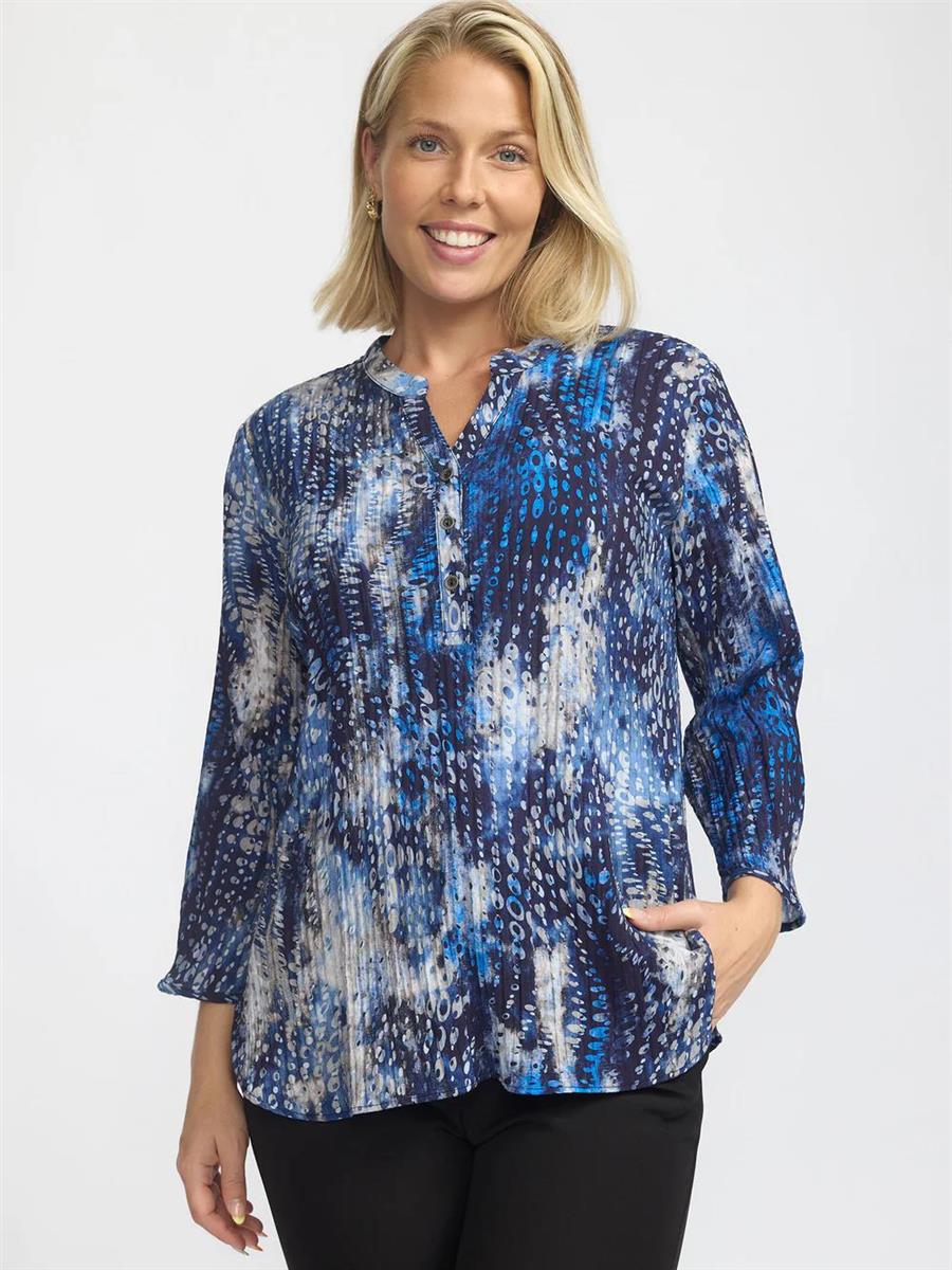 Elegant bluse med unikt, abstrakt mønster i nuancer af blå, grå og hvid, som tilføjer et kunstnerisk touch til dit outfit.Blusen har en flatterende pasform med trekvartlange ærmer og smukke knapdetaljer foran. Den lette og behagelige kvalitet gør den ideel til både hverdagsbrug og mere formelle lejligheder. Perfekt til at parre med både jeans og pænere bukser for et alsidigt look.
