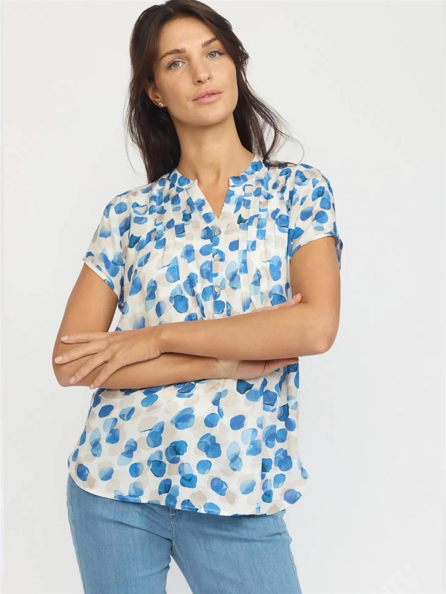 Sød bluse fra 2-Biz med korte ærmer, kinakrave med v-udskæring i halsen og et kort knappanel over brystet samt et skønt farverigt print og en blød kvalitet.
