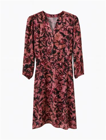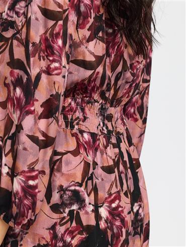 Flot mønstret kjole fra 2-BIZ med 3/4 ærme med elastik. Kjolen har en lille v-hals udskæring, elastik bånd bagpå ved ryg, der giver kjolen figur.