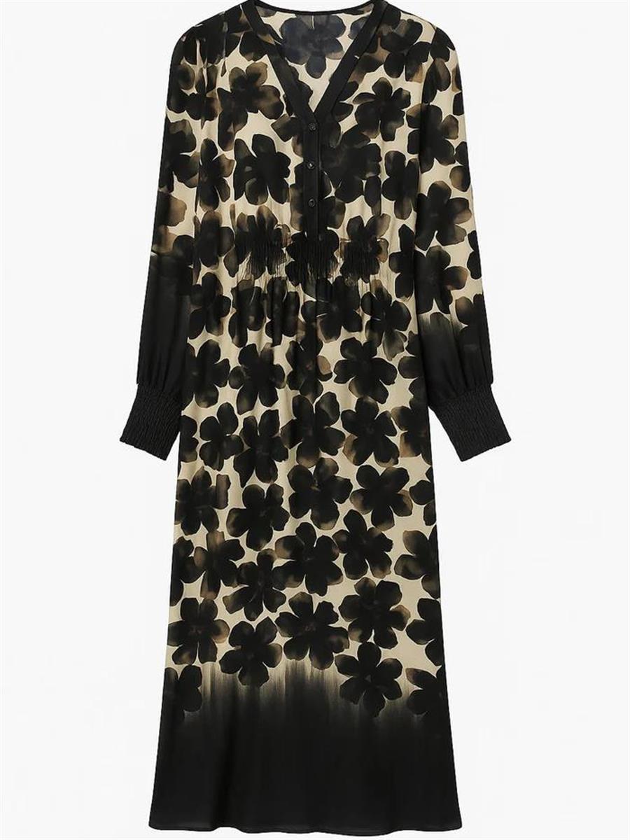 Smuk mønstret kjole med lange ærmer og smock fra 2-BIZ.