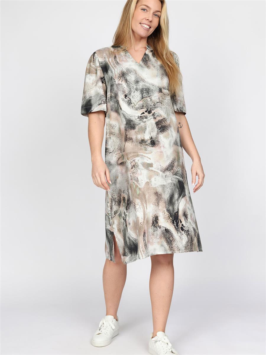 Den fineste kjole fra 2-Biz i skønne beige farver, som har kina krave med v-udskæring og korte ærmer.