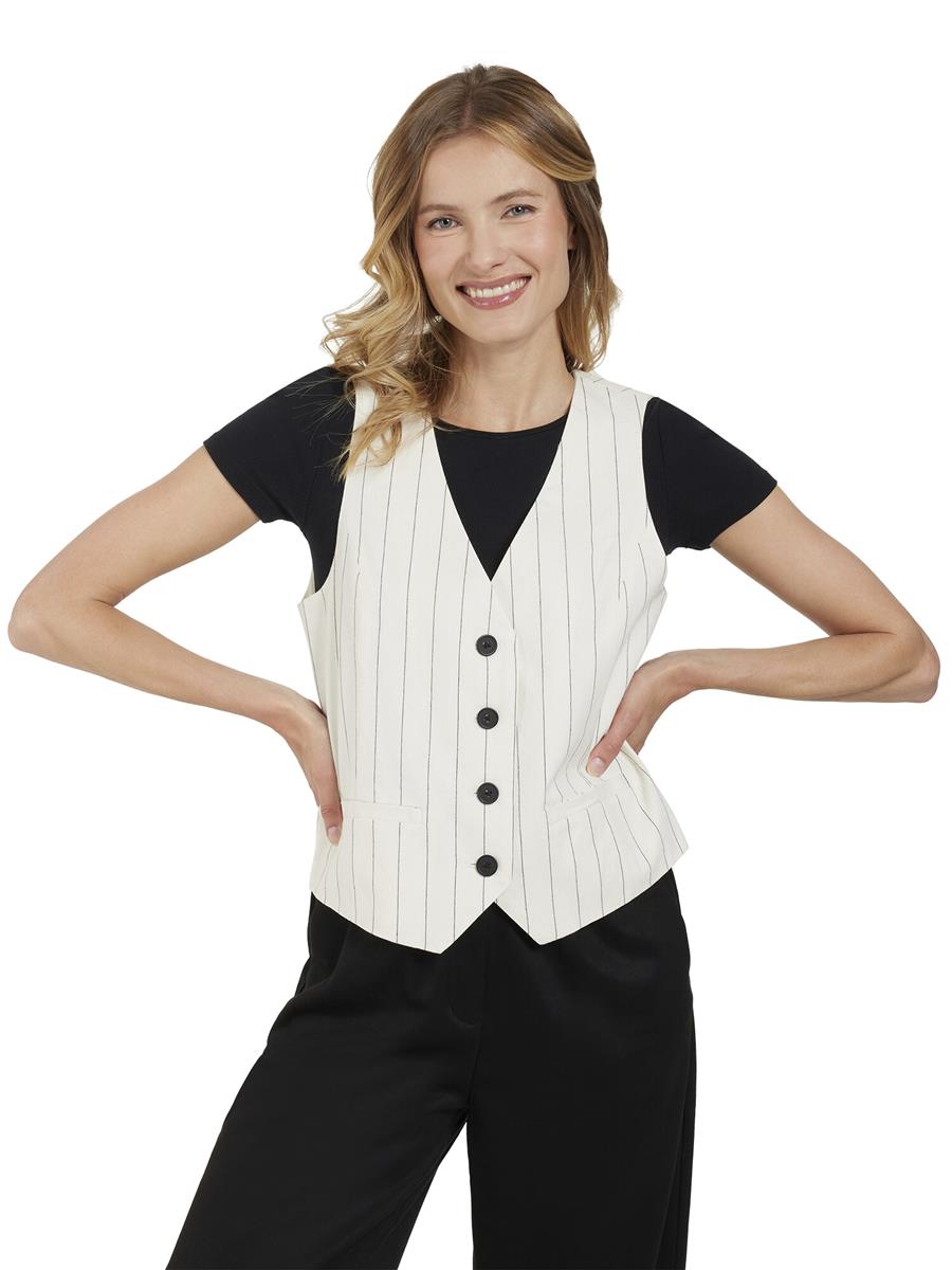 Flot facon syet pinstripe vest i smuk råhvid farve om med tynd sort strib.