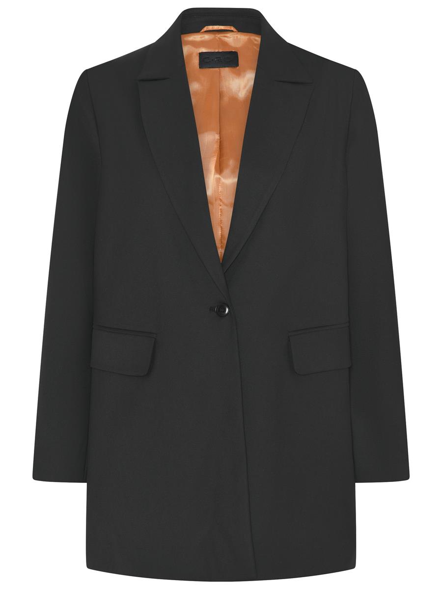 Blazeren lukkes med en enkel knap og har et lidt bredere revers. Den har to skrå lommer og slidser i siden som en smart detalje. Den har ligeledes en lille slids ved ærmet.
