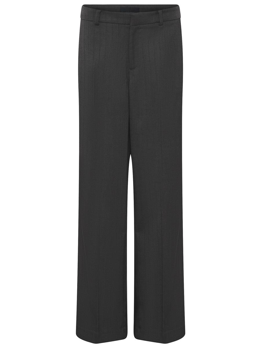 Buksen er mørkegrå med et flot sildebensmønster.