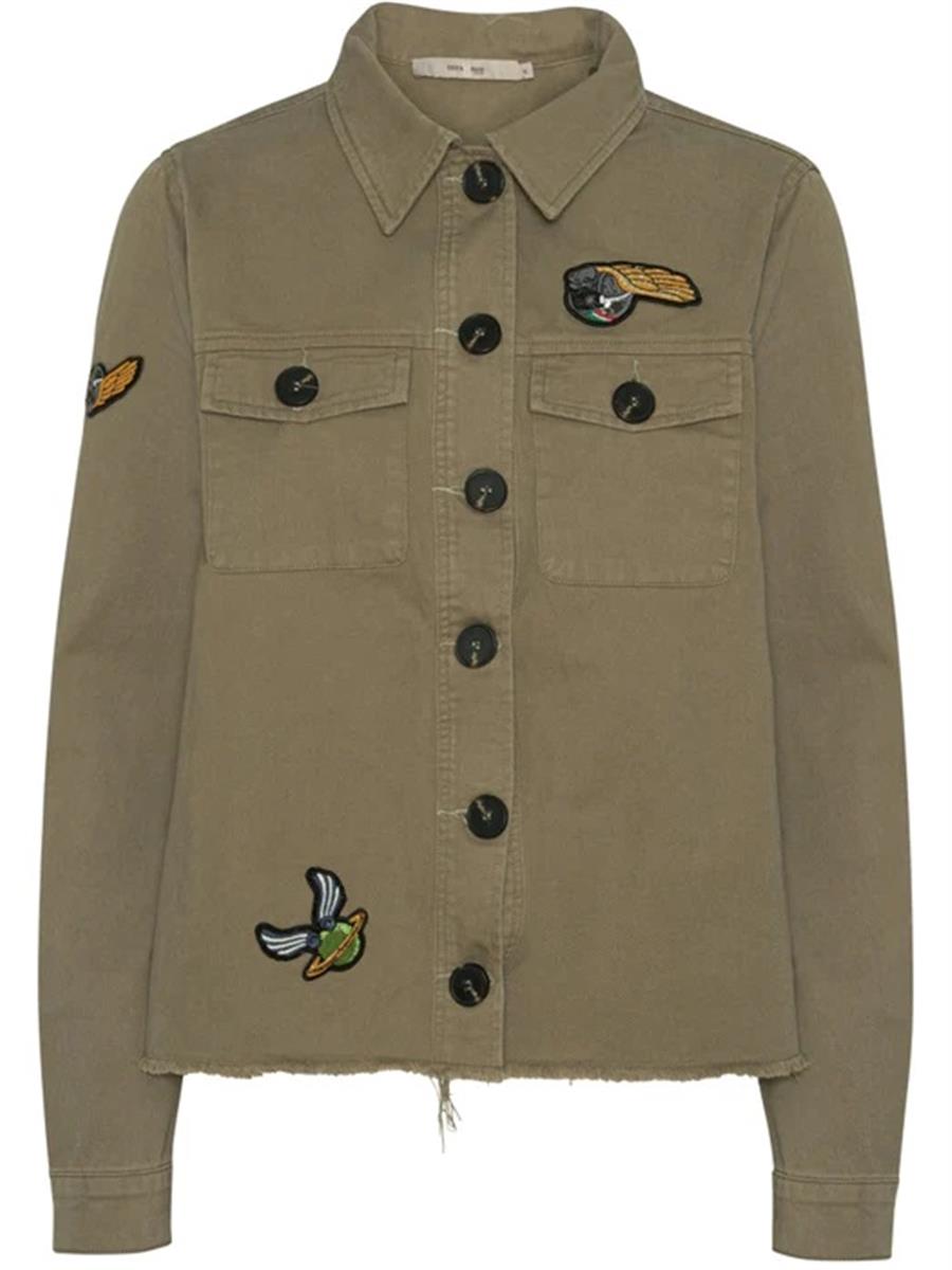 Lækker army jakke fra Costamani med cool påsyede badges. Jakken kan styles råt til bukser, men er også super god over en kjole. Jakken er ensfarvet army på ryggen.