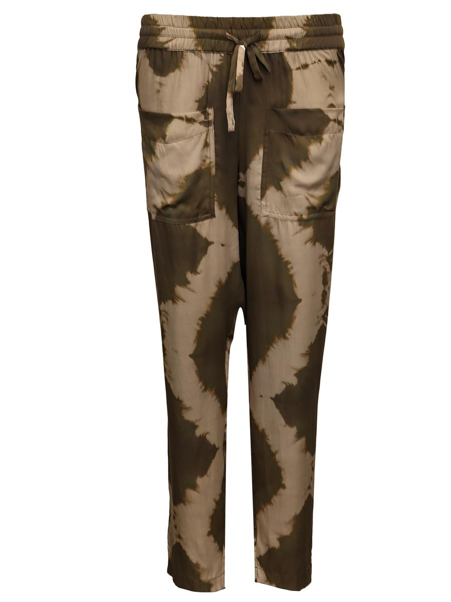 Lækre løse bukser fra Costamani i et smart batikmønsler i brunlige farver. Buksen har elastik i linningen og store firkantede lommer foran. Bagpå har buksen paspolerede lommer (lukkede). Benvidden er moderat.