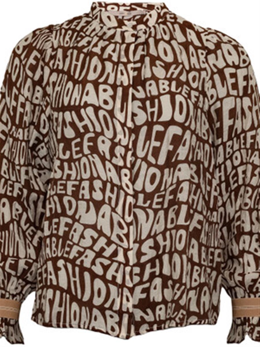 Lækker og let skjorte fra CostaMani i tidens flotte brune farve med "skrift". Skjorten er gennemkanppet og med fin perle knap i halsen. den er med alm rund hals og fin afslutning på ærmerne med bred elastik kant.