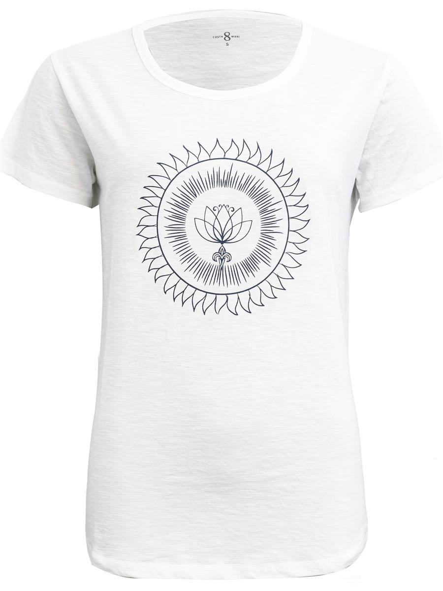 Sød og enkel t-shirt fra Costamani. T-shirten har en iris blomst i sort på fronten. Den har korte ærmer og er lidt rummelig i størrelsen.