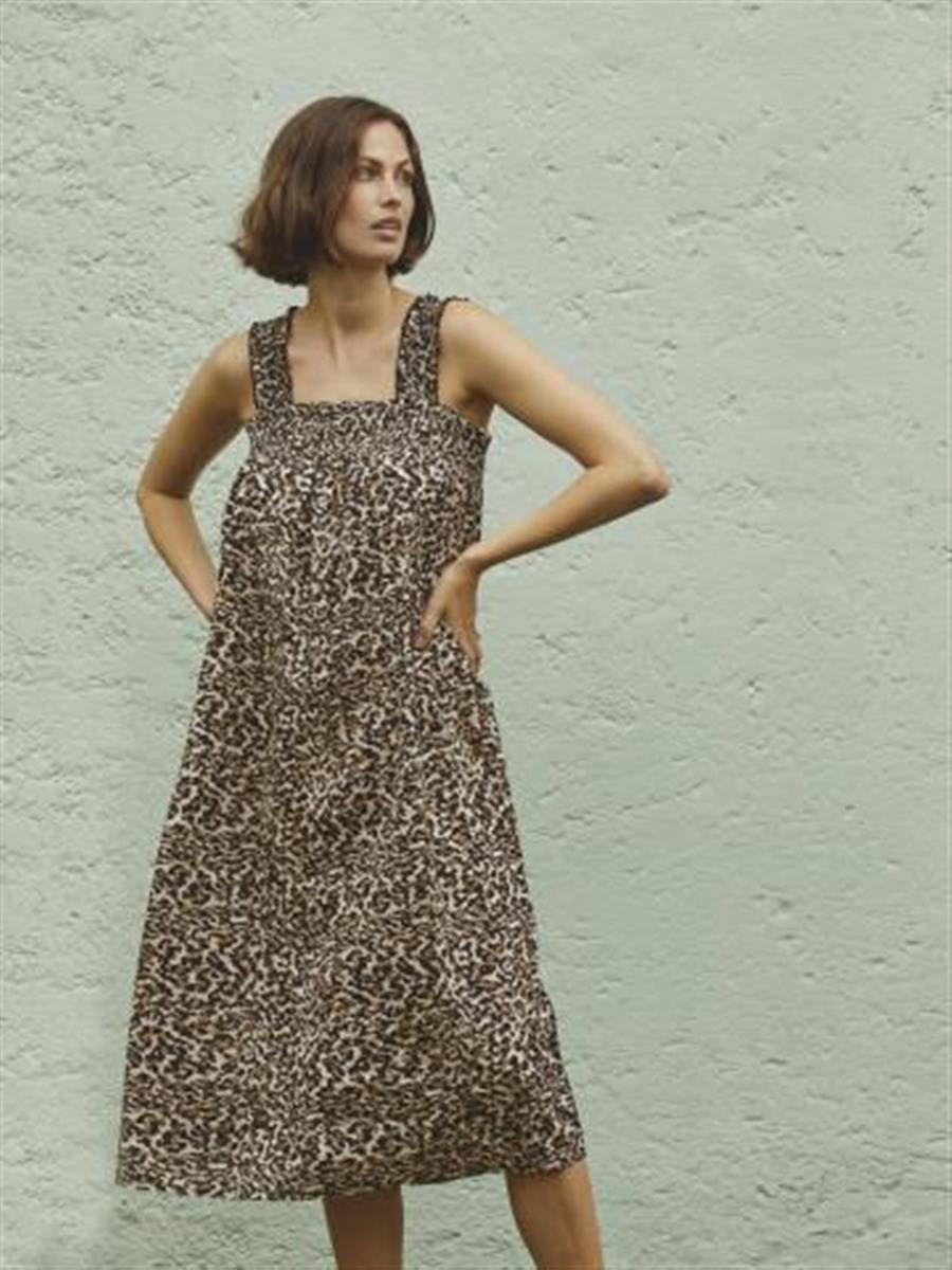 Kjolen er med brede stropper og et brest elastikstykke med rynkeeffekt over brystet.