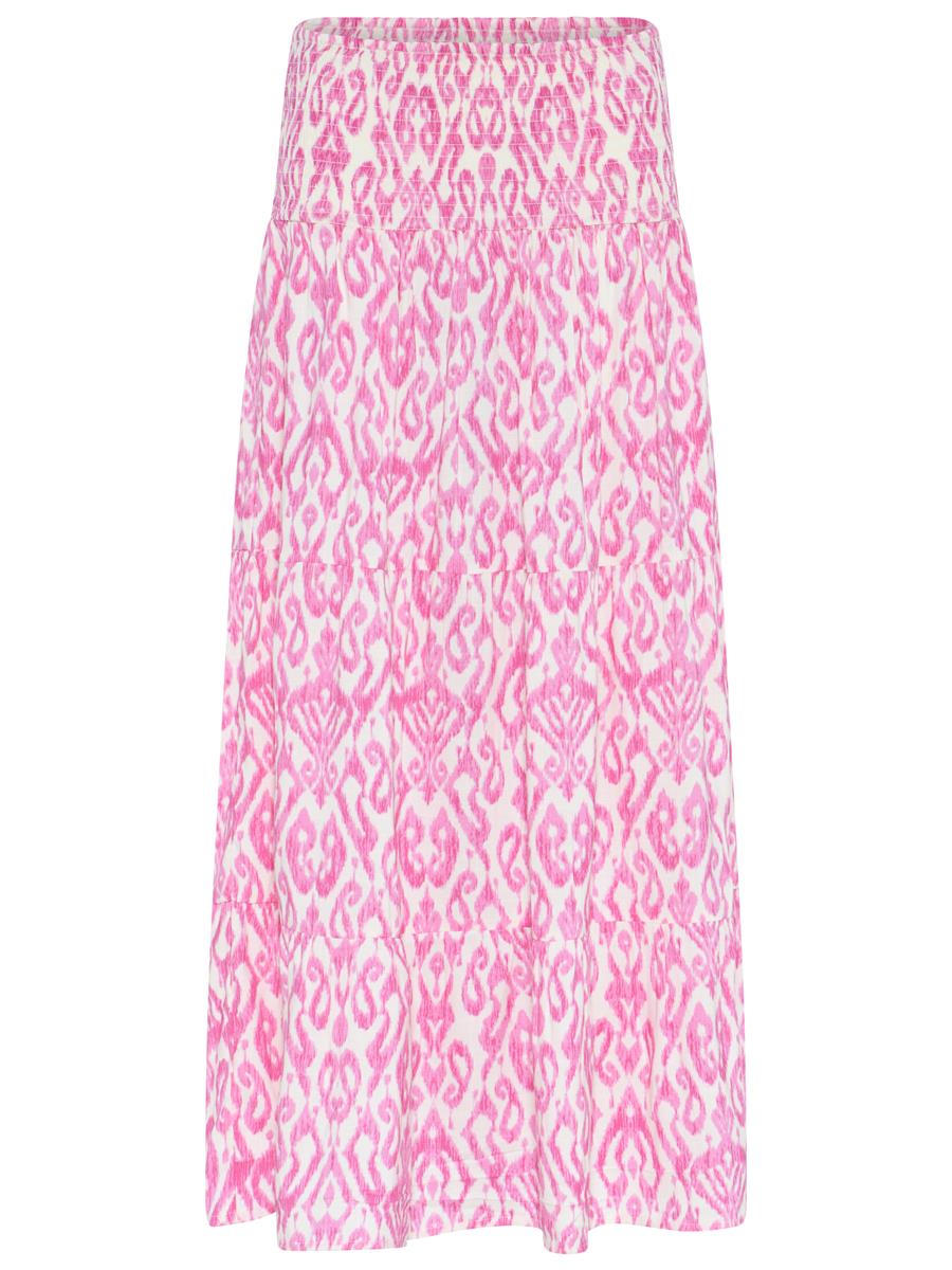 Nederdelen har et bredt stykke med smock foroven og brede flæser på nederste stykke.