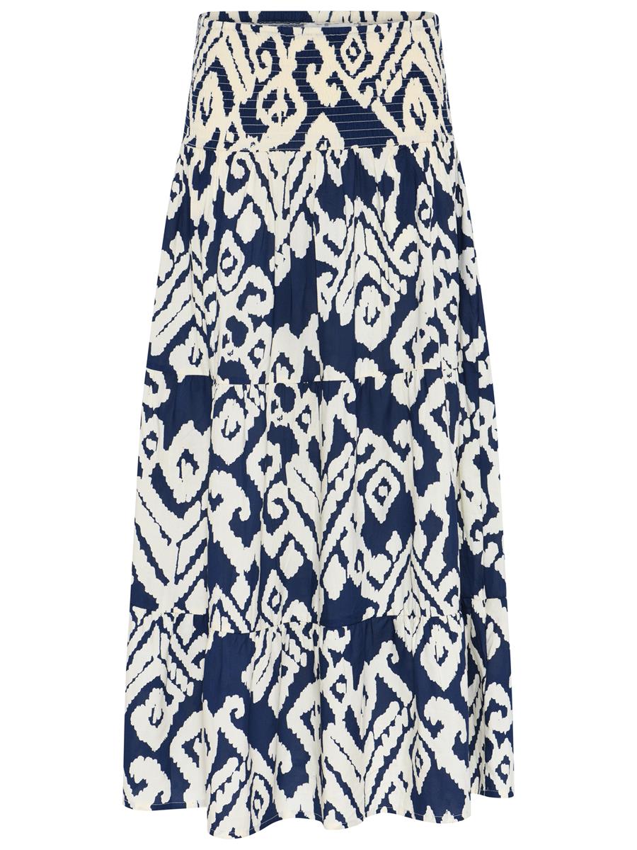 Nederdelen har et bredt stykke med smock foroven og brede flæser på nederste stykke.