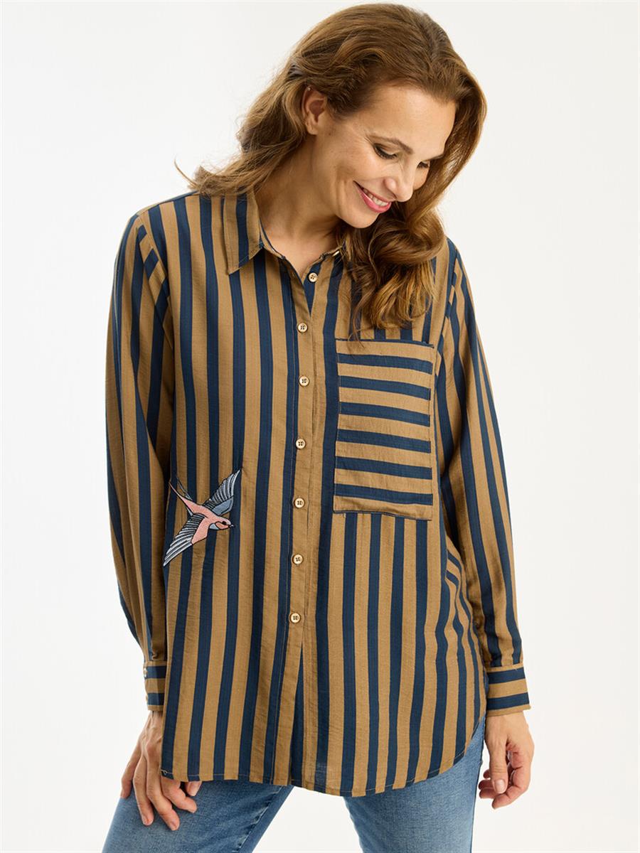 Fin INFRONT skjorte med mørkeblå og brune striber, samt smart broderi af fugle.