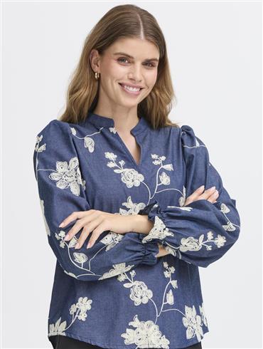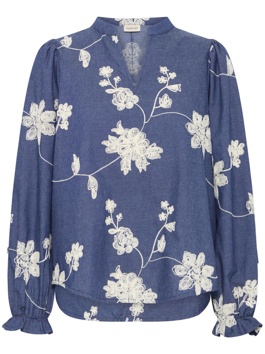 Smuk blå bluse fra Fransa med hvide broderet blomster på.