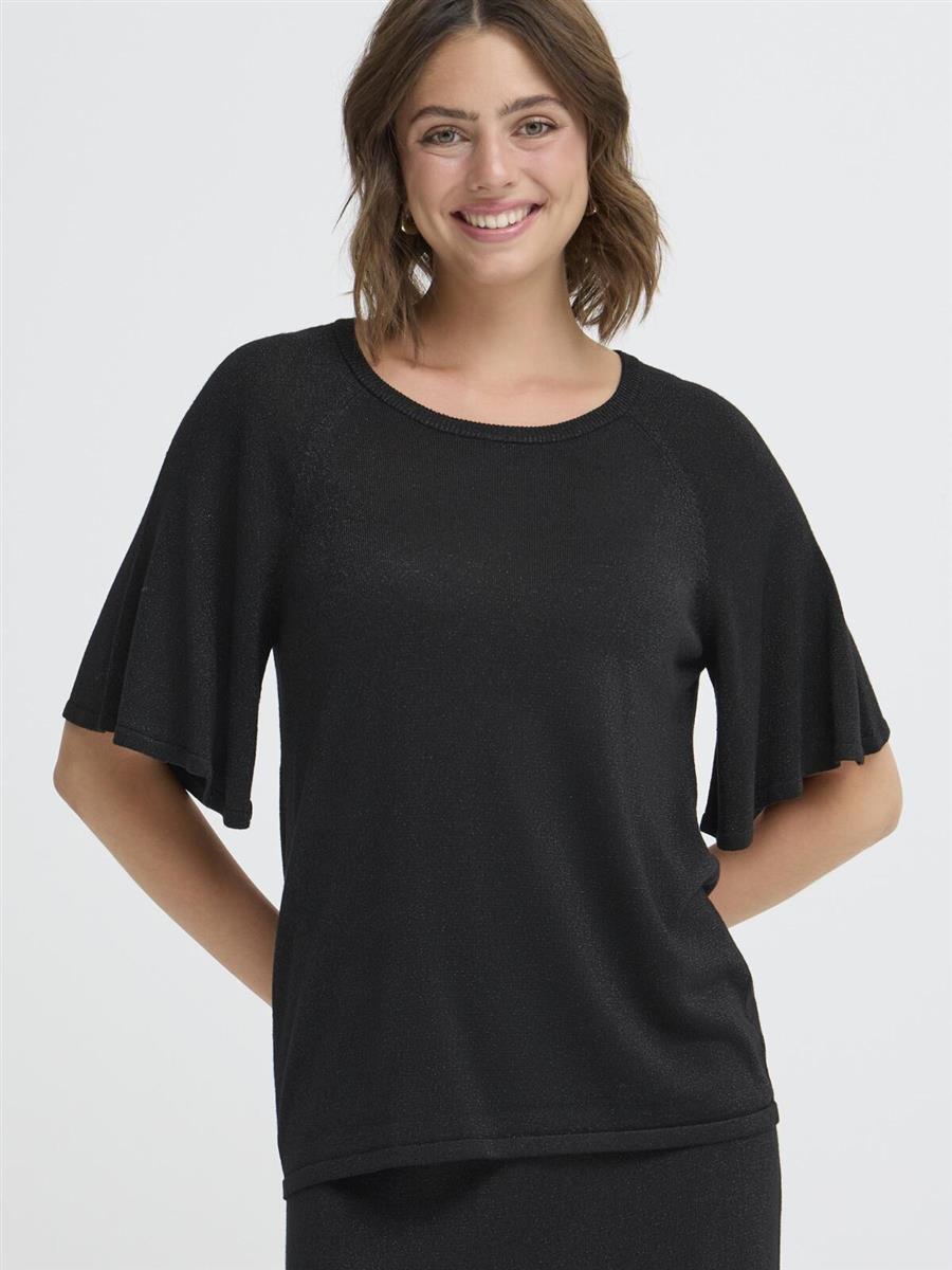 Strikket sort bluse med sølvglitter, rund halsudskæring og korte trompet-ærmer.