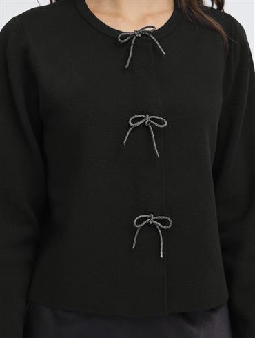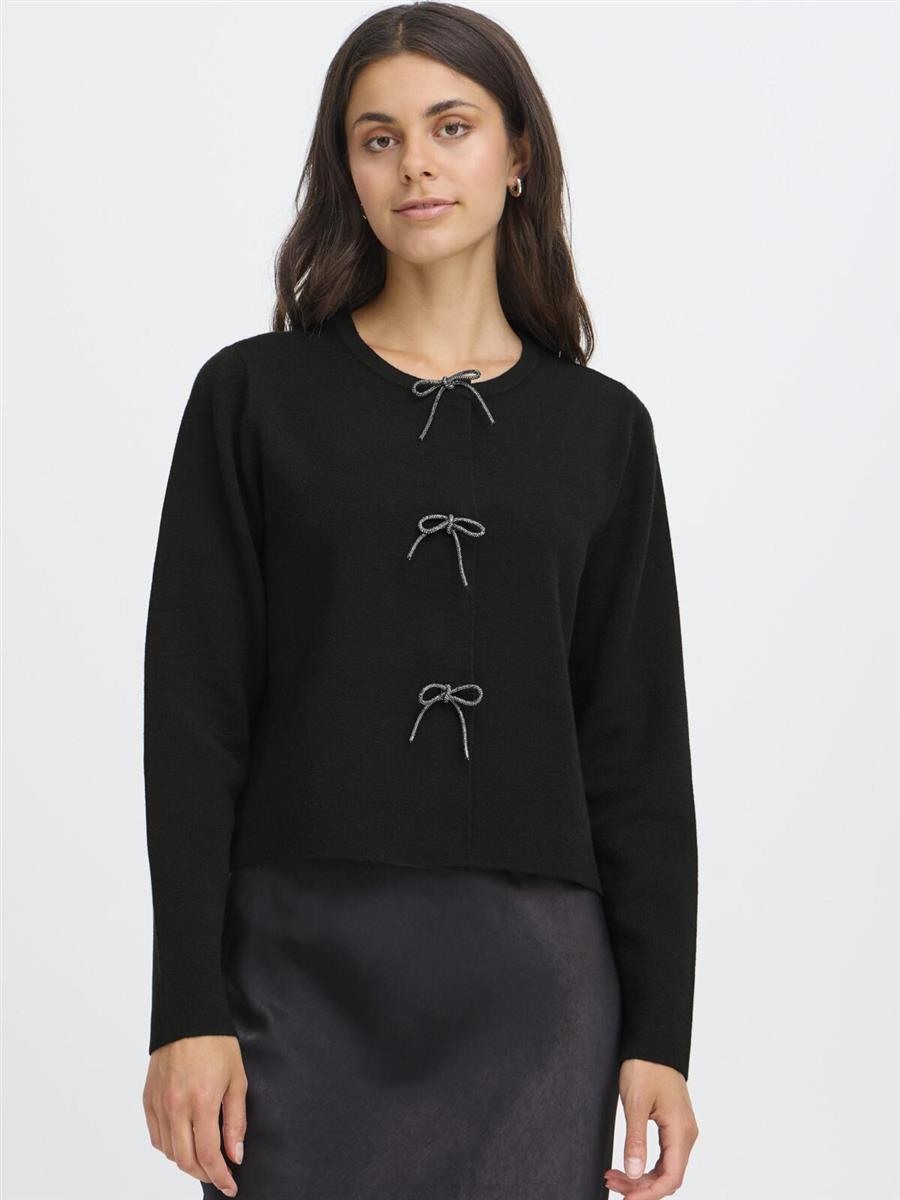 Feminin cardigan fra Fransa. Cardiganen er gennemknappet med fine glitrende sløjfer foran.