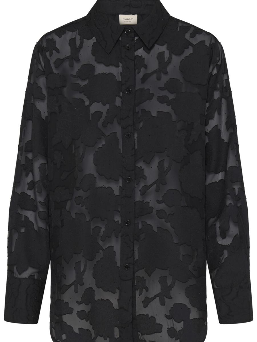 Smuk skjorte fra Fransa med sort blomstermønster og små glitrende sorte sten.