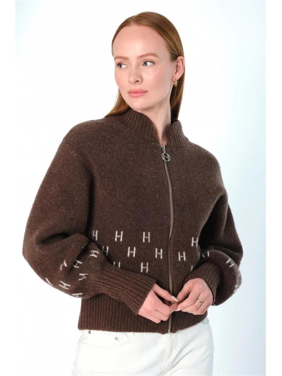 Trendy kort strik jakke fra HÈST med lynlås. Jakken har høj krave, bred ribkant forneden samt på ærmer.