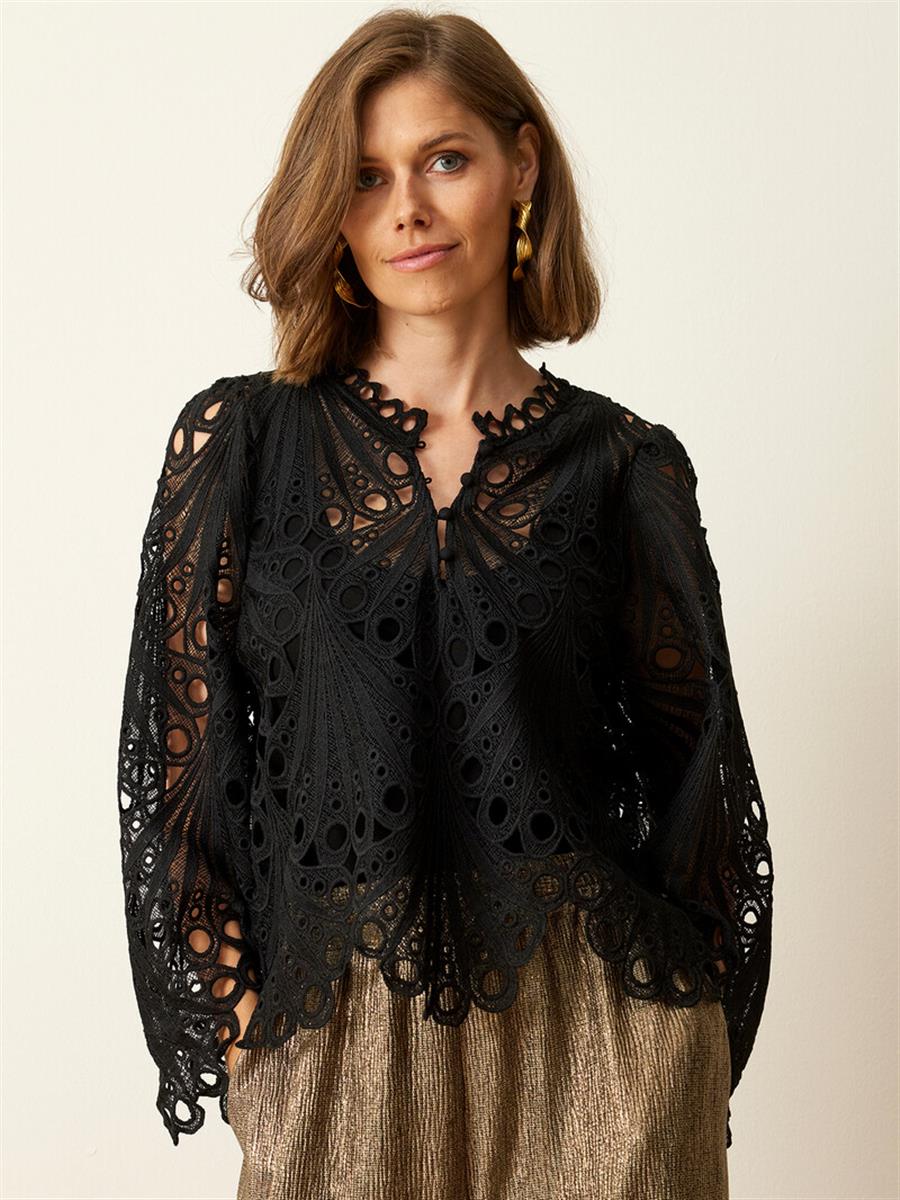 Smuk og elegant blondebluse fra InFront i gennemgående blonde- og hulmønster. Flæsedetaljer ved halsåbningen som har en stolpelukning med 4 stofknapper, så den kan åbnes lidt mere op i halsen, hvis man foretrækker det. Blusen har et let puf ved skulderne og brede flagermusærmer. Et elegant og raffineret valg til julefrokost, fødselsdag og andre festlige anledninger. Bær en sort top under med korte eller lange ærmer, evt en mesh top.