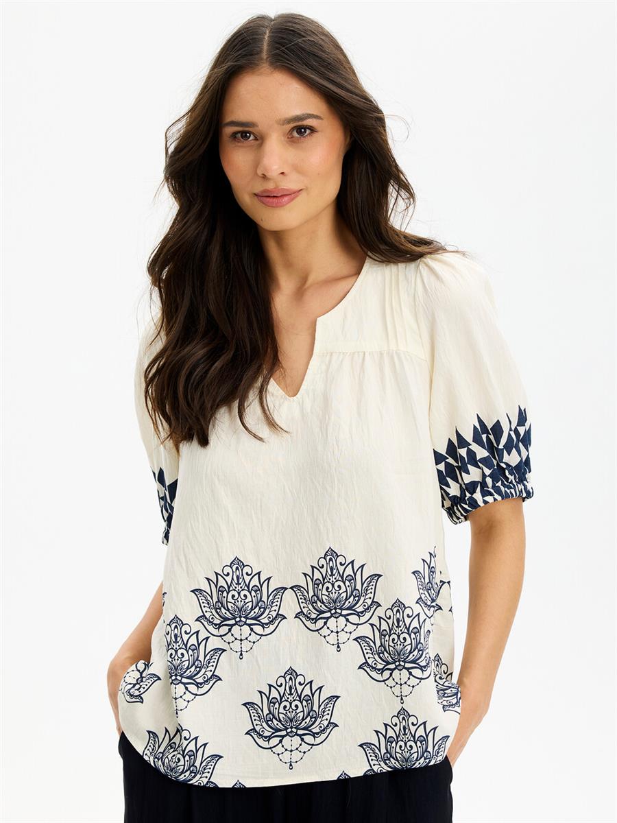 Super flot bluse med elastik i ærmekant, skæring over brystet foran og ved lænd på ryggen. Blusen er fin og tynd i kvaliteten og med flot broderi på ryggen.