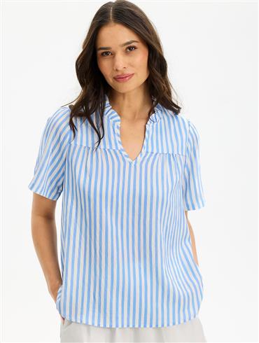 Smart sommerbluse fra InFront med stribede detaljer og dyreprint på ryggen. Blusen har et fint V-udsnit ved halsen og en lille flæsekant ved kraven.