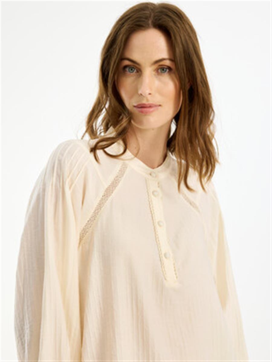Offwhite skjorte med 3/4 ærmer, kinakrave og betrukne knapper. Skjorten har stolpelukning.