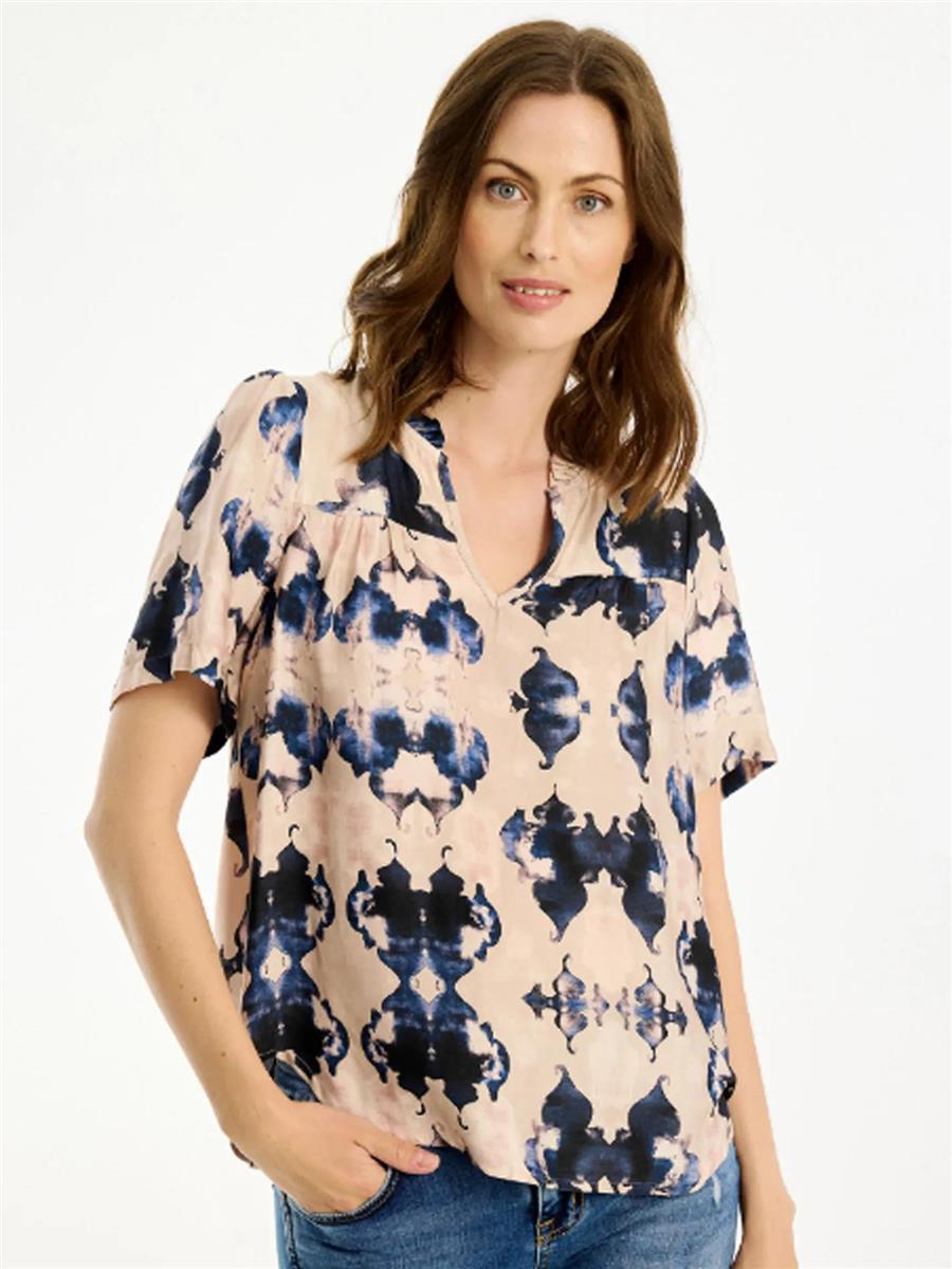 Sød bluse fra In Front med korte ærmer, rund hals med v-udskæring og et fint print.