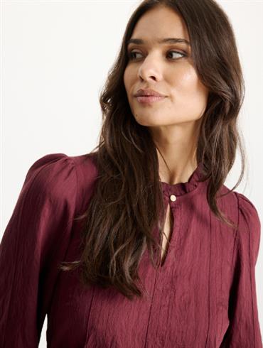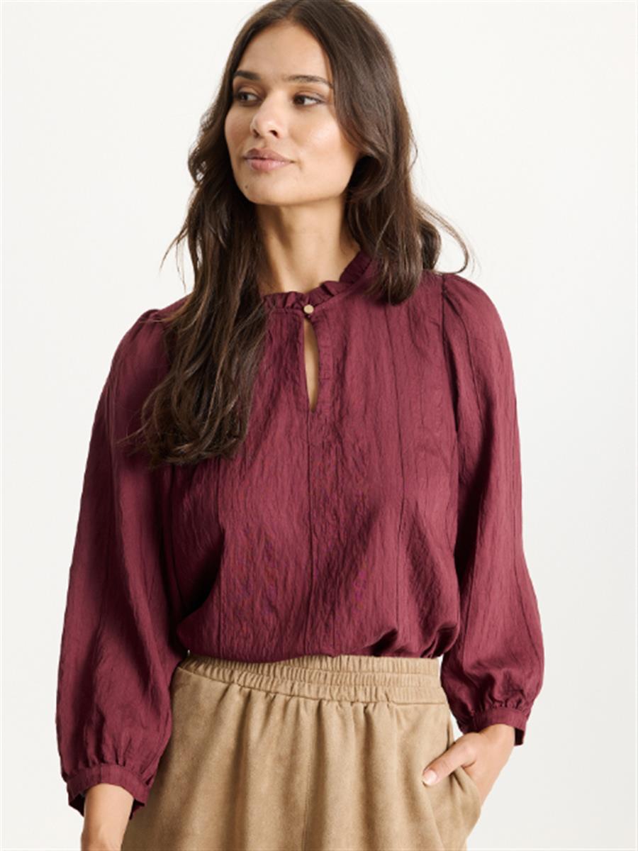 Blusen er med 3/4 ærme, rynket look, halsudskærring med lille flæsekant og lille guldknap.