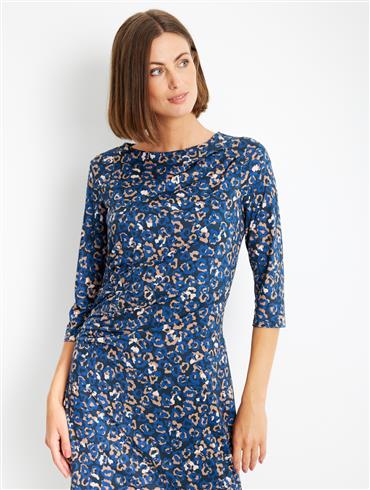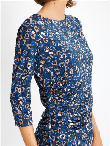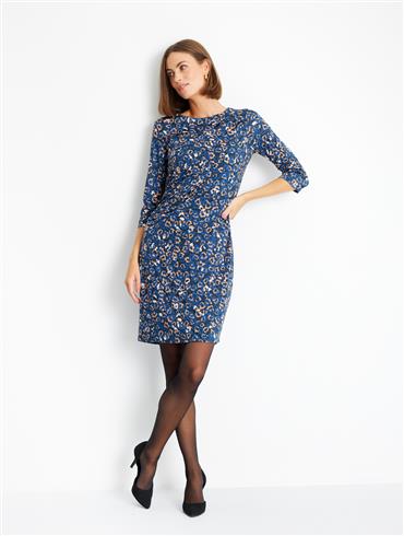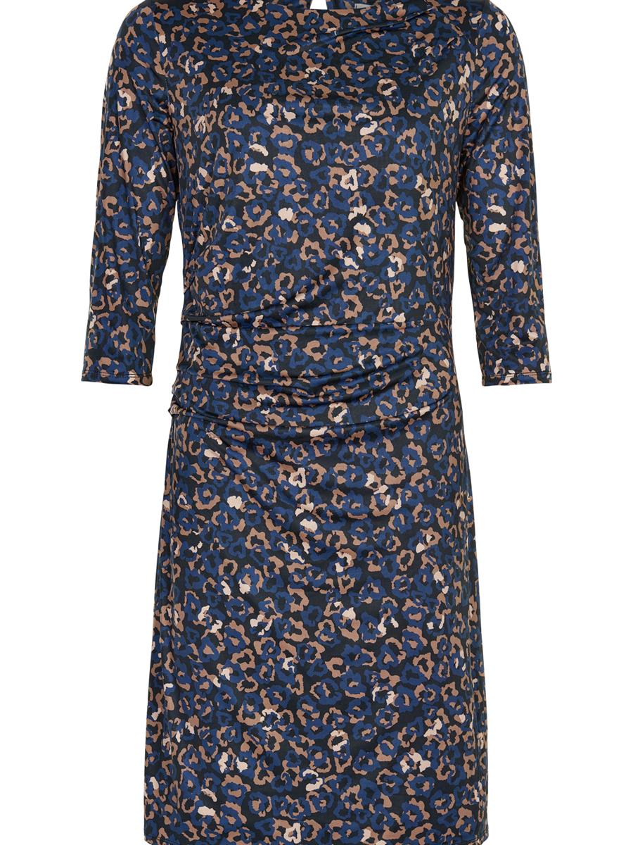 Sød blå printet kjole fra InFront. Kjolen er med 7/8 lange ærmer og rund halsudskæring. Kjolen går en smule ind i taljen så den rigtig fremhæver taljen.Kvalitet: 95% Polyester - 5% Elasthane
