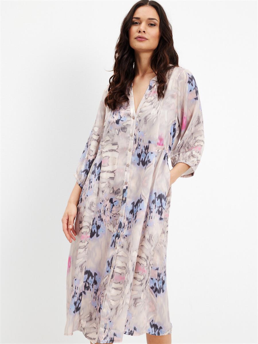 Kjolen er med 3/4 lange ærmer, som slutter med en elastikkant. Kjolen er med v- udskæring og fine pynteknapper hele vejen ned. Kjolen er i de smukkeste rosa nuancer. Bindebånd ved taljen så den kan snøres lidt ind i taljen hvis man ønsker det. Kvalitet: 100% Viskose