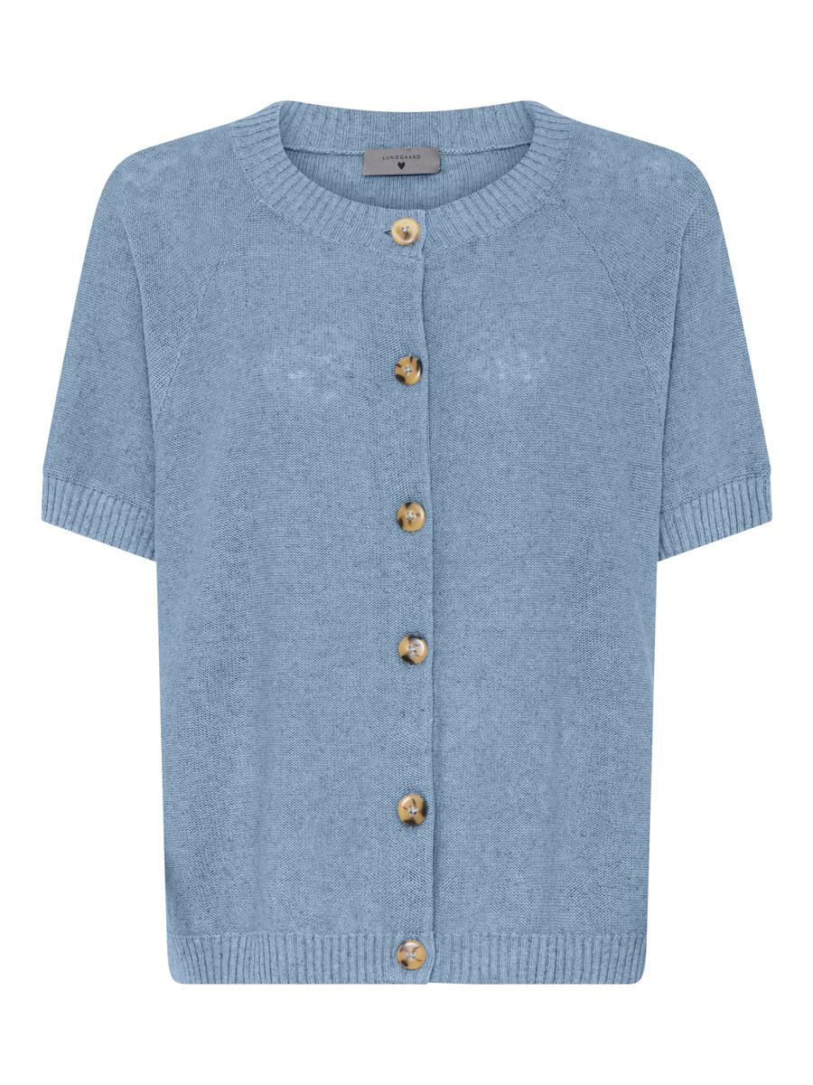 Cardiganen er gennemknappet og med korte ærmer. Den har rund halsudskæring og bred rib langs kanterne.