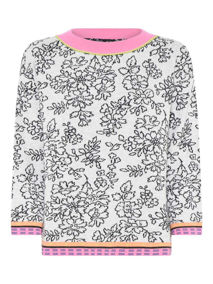 Strikken er med et fint blomstermotiv og rib i kontrastfarver.