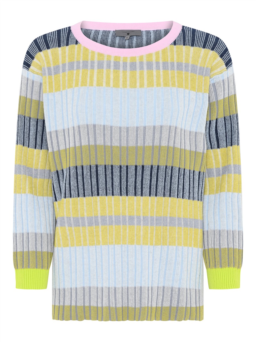 Strikken er med brede striber og rib i flot kontrastfarve.