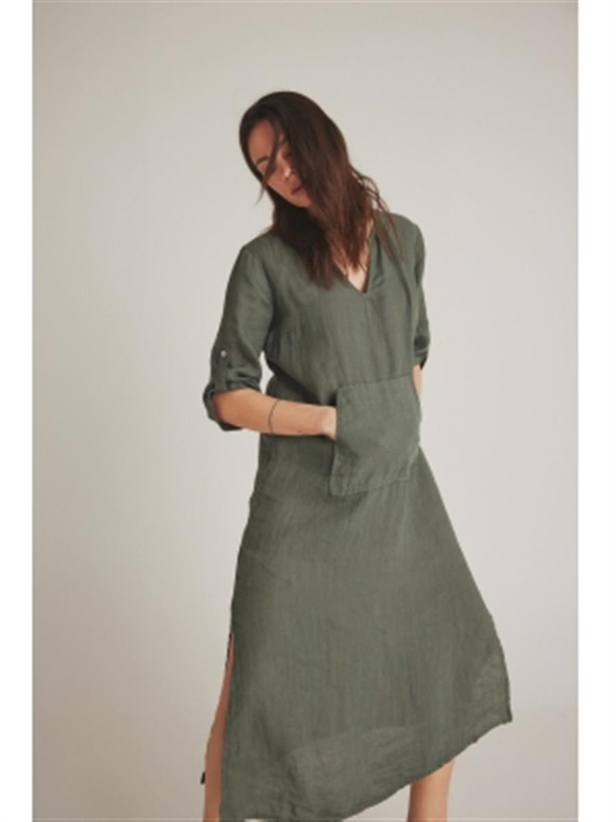 Flot lang hørkjole fra LUXZUZ ONE TWO. Kjolen har fin strop / ombuk detalje på de lange ærmer. Den runde hals åbner op i et V, slidser i hver side samt en lomme på forsiden af kjolen. Pasformen er moderart løs.