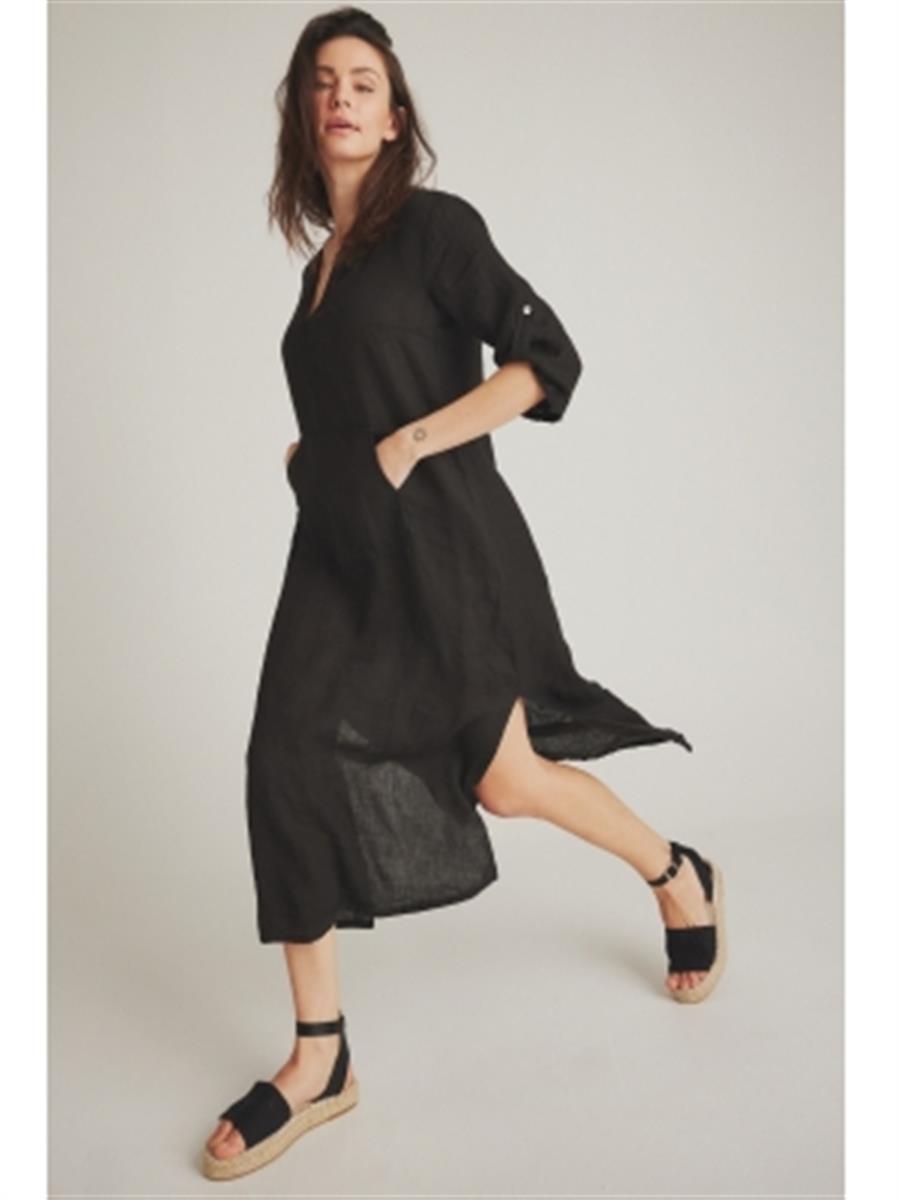 Flot lang hørkjole fra LUXZUZ ONE TWO. Kjolen har fin strop / ombuk detalje på de lange ærmer. Den runde hals åbner op i et V, slidser i hver side samt en lomme på forsiden af kjolen. Pasformen er moderart løs.