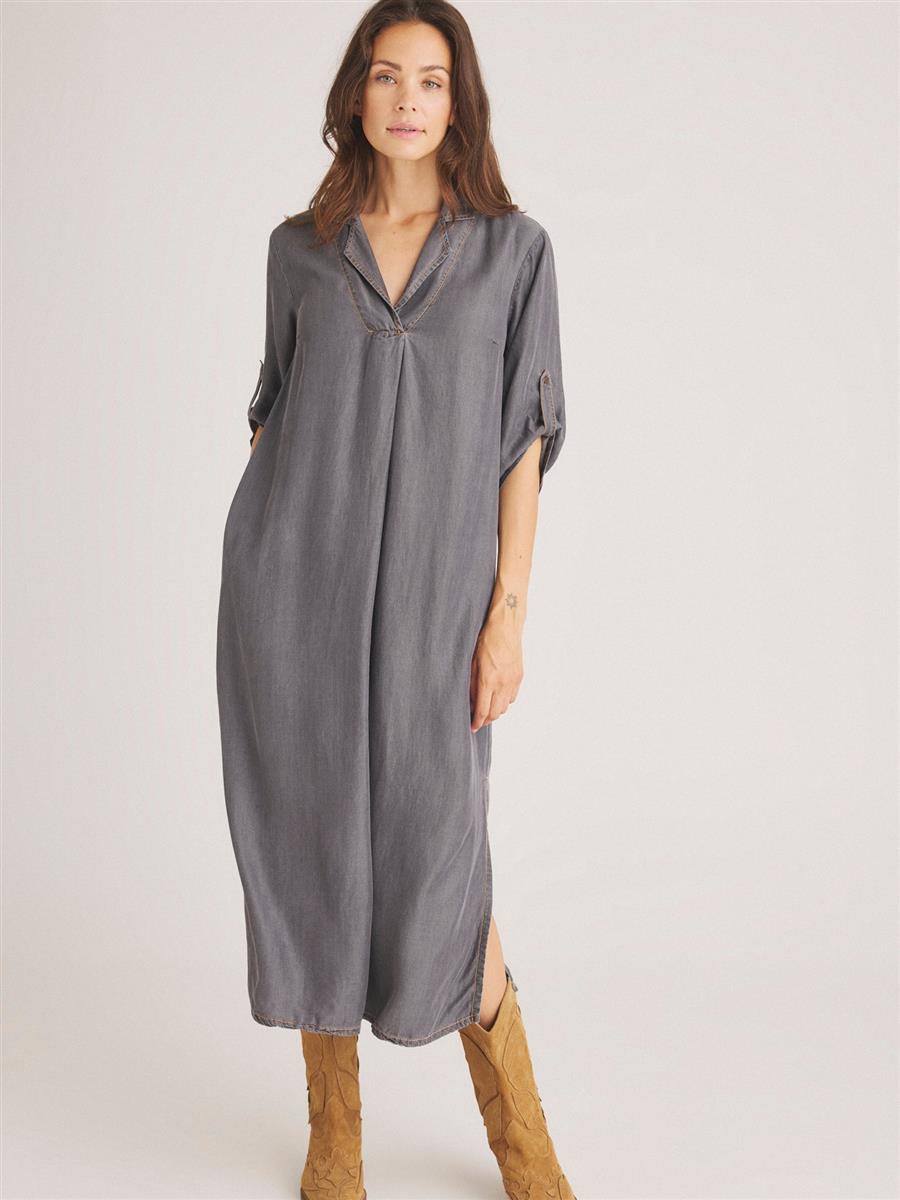 Utrolig skøn og afslappet kjole fra LUXZUZ ONE TWO. Fin strop / ombuk detalje på de lange ærmer. Lommer og slidser i hver side, flot halsudskæring der ender med et læg, som giver lidt vidde til kjolen.Stoffet er det fineste og super bløde Lyocell denim.