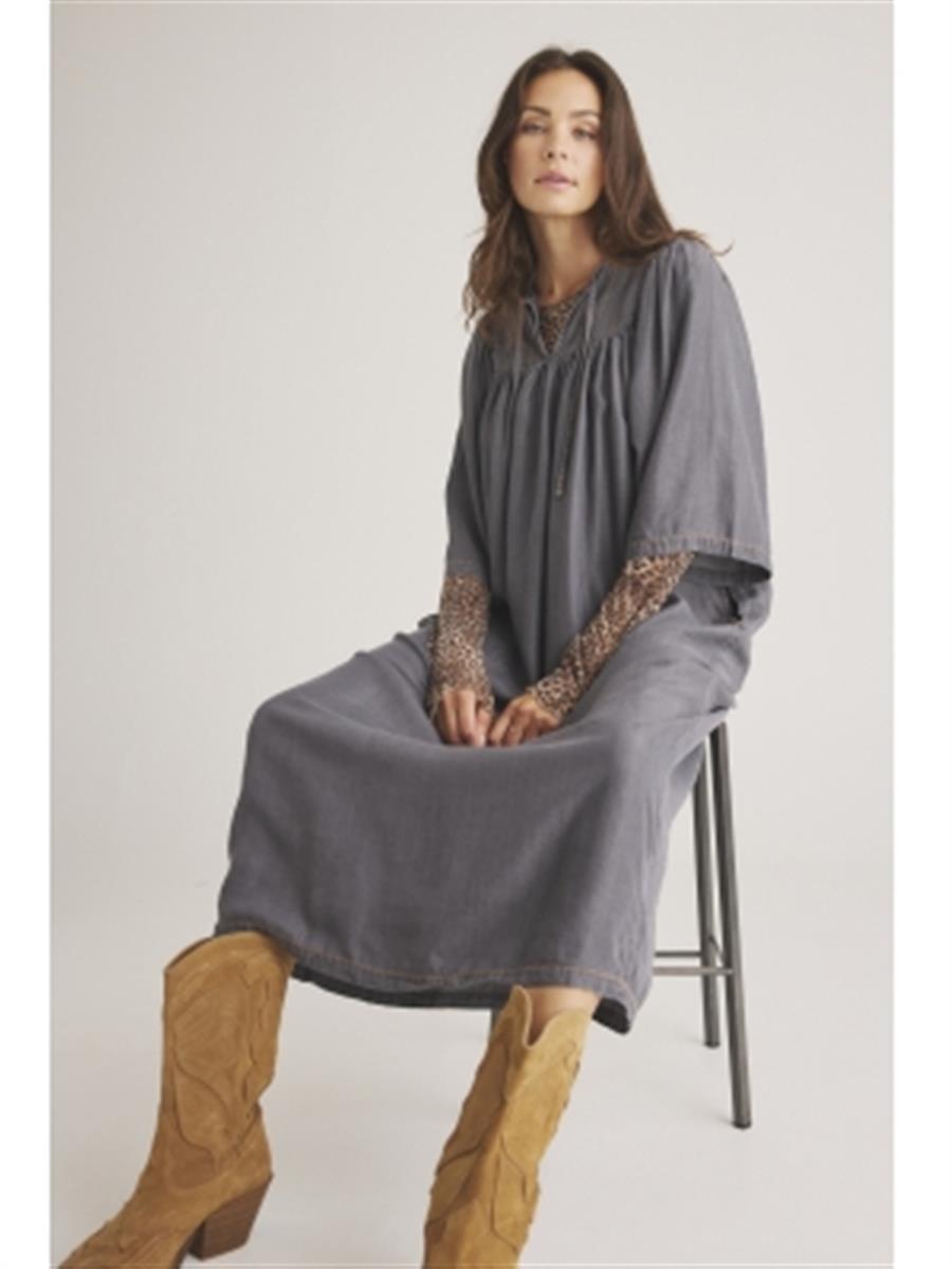 Smart kjole fra LUXZUZ ONE TWO. Kjolen er moderart oversized, har rundhals med en slids og binde bånd. Lommer i siderne samt skønne 3/4 lange løse ærmer. For og bag har kjolen et bærestykke med syninger, som en fin detalje. Stoffet er det fineste og super bløde Lyocell denim.