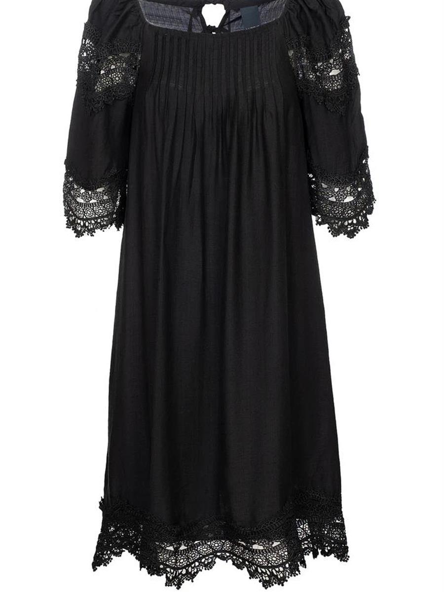 Feminin kjole fra LUXZUZ // ONE TWO med fine blonde detaljer.Denne smukke kjole har en løs og let pasform, der giver et behageligt og elegant look. Fine blonde detaljer på de trekvartlange ærmer samt på bundkanten tilføjer et feminint touch. På bagsiden har kjolen et flot snøredesign, som giver både struktur og en ekstra detalje.