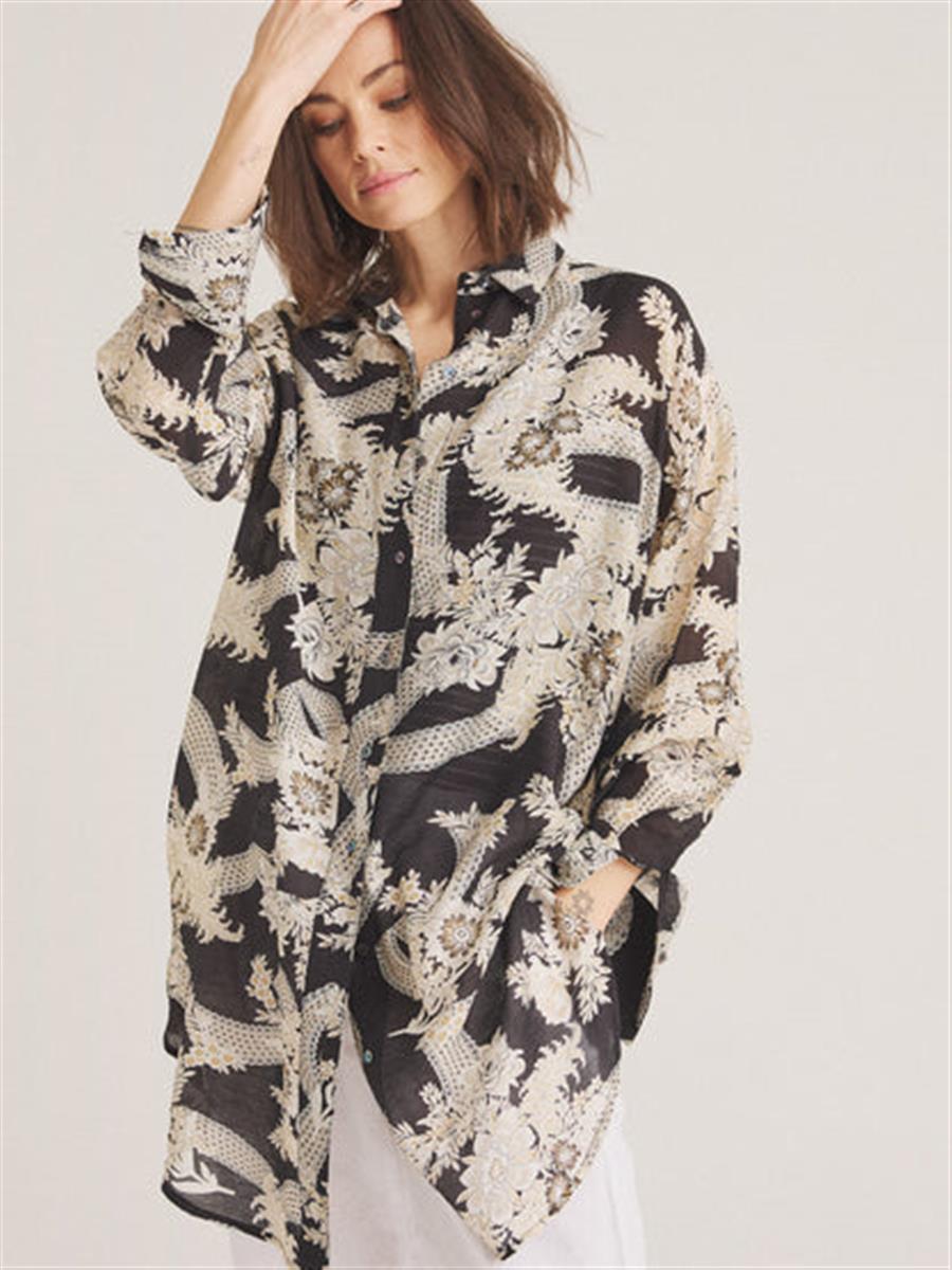 Lang skjorte fra LUXZUZ // ONE TWO med knaplukning og klassisk krave.Skjorten har et elegant blomsterprint og lange ærmer med en bred manchet og 2 knapper, bundkanten runder pænt og giver et feminint look.Den løse pasform og længde gør den både afslappet og stilfuld.