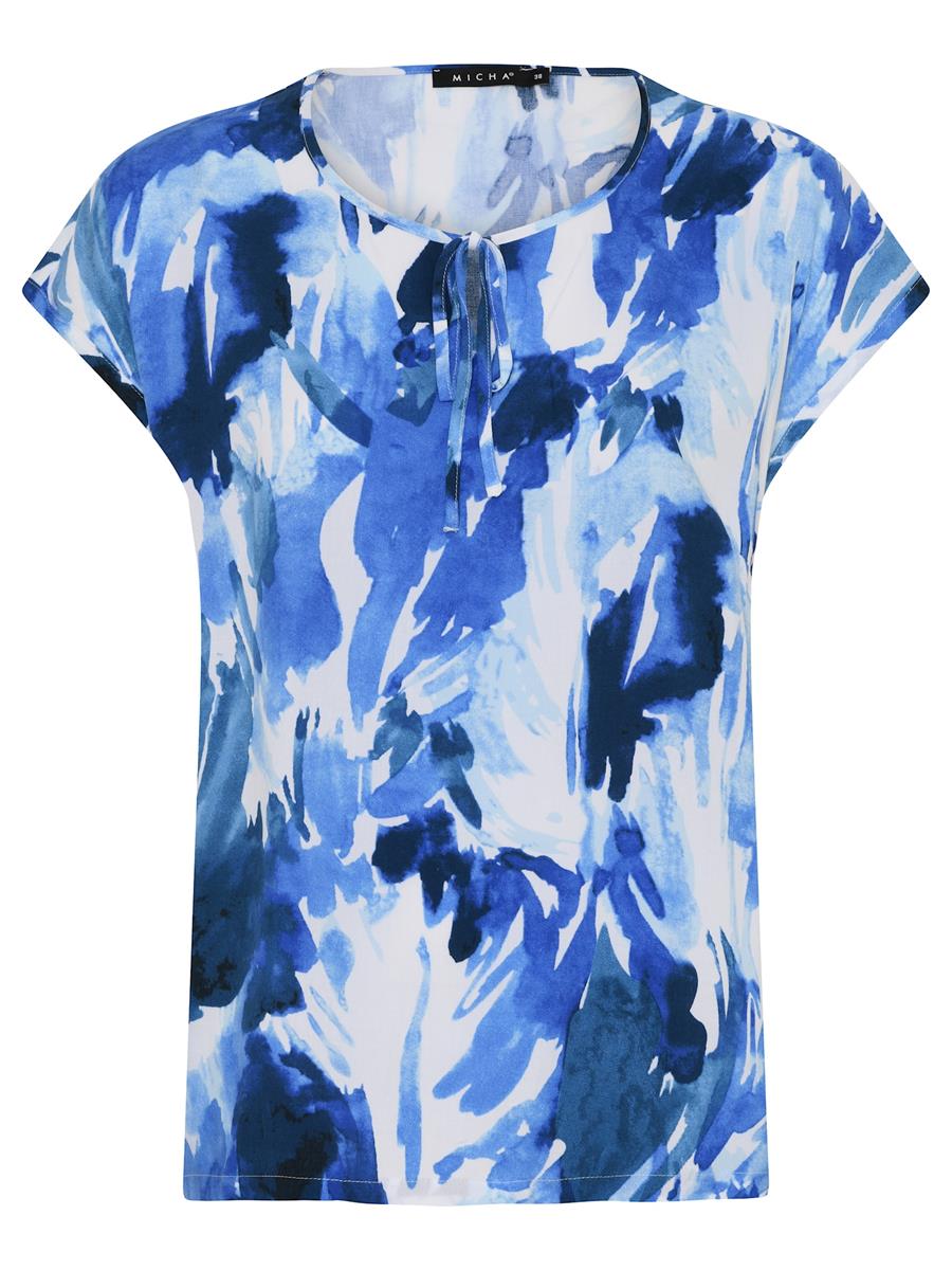 Super fin bluse med korte ærmer og lille snørre i den runde halsudskæring. Smukt Blå print.