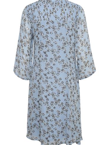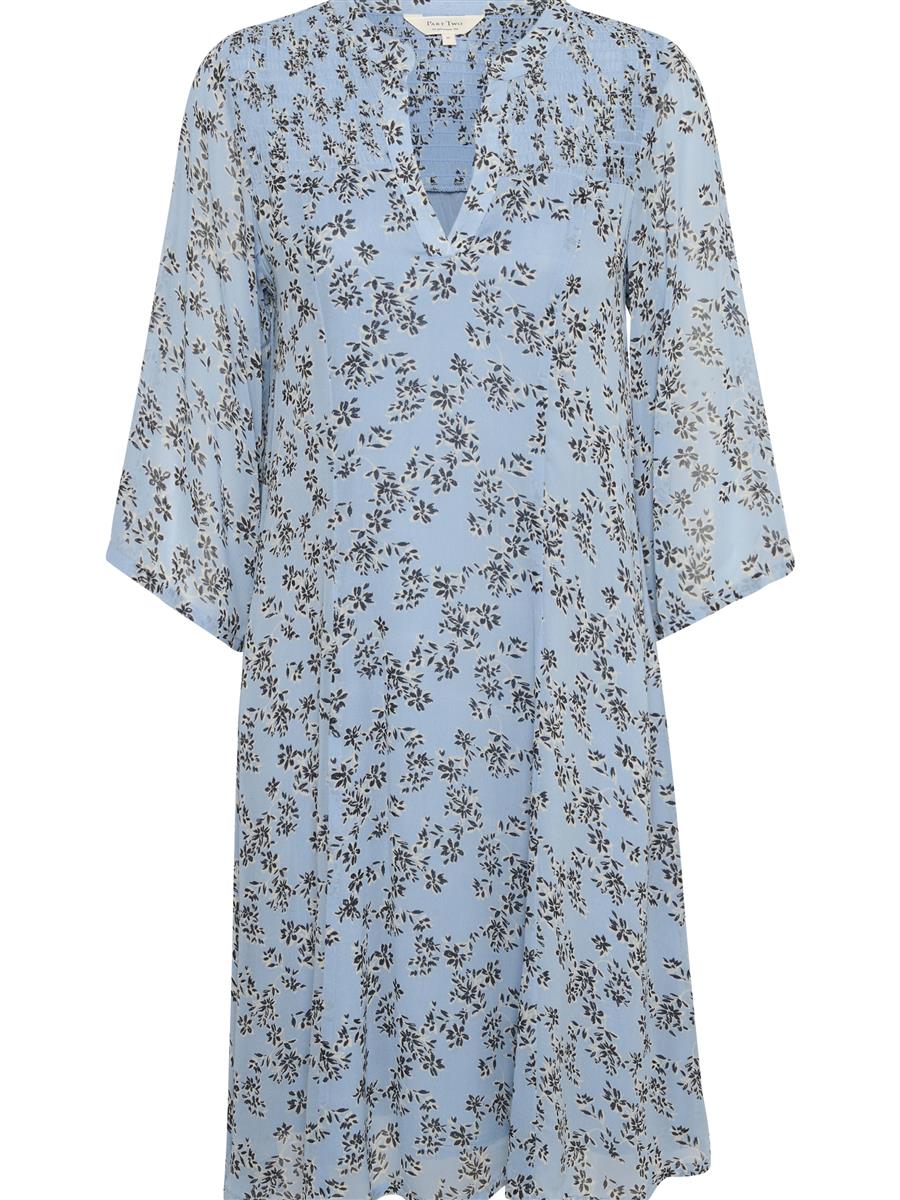 Let og elegant kjole fra Part Two i et nostalgisk dueblå blomstret mønster. Lette ærmer, men underkjole i ved kroppen. Flotte detaljer ved skuldrene.
