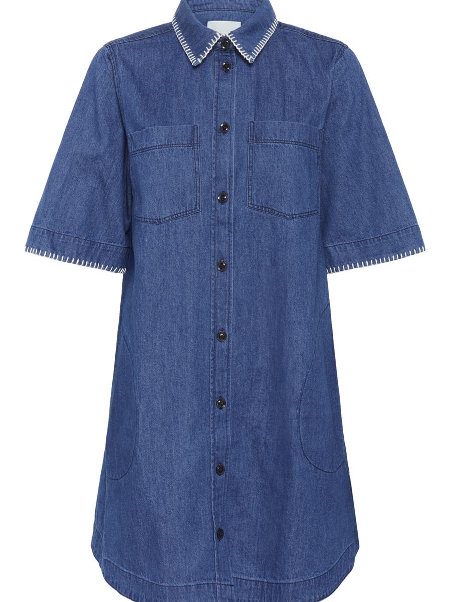 Skjortekjole i blød bomuldsblanding med afslappet a-pasform og korte ærmer. Kjolen er gennemknappet med brystlommer og har hvide pyntestiklinger på krave og ved ærmerne. Brug den som kjole eller lang åben skjorte-cardigan.