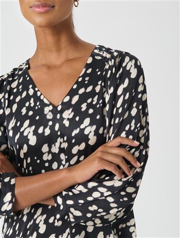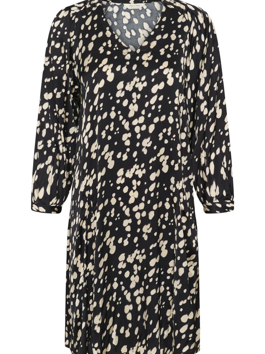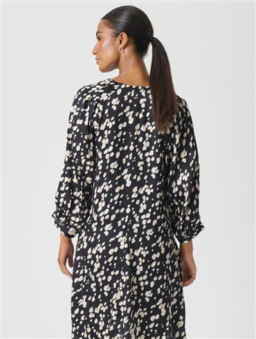 Denne korte/midi kjole med grafisk print har en løs pasform, V-udskæring og voluminøse 3/4-ærmer med let rynkeeffekt.