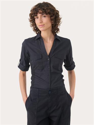 Ærmerne kan let rulles op og fæstnes med knapstropper, hvilket gør den alsidig i brug.