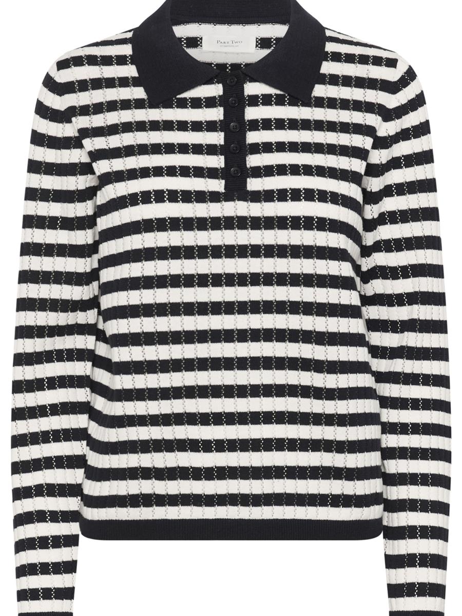 Flot stribet striktrøje i marineblå og hvid er lavet i en let, åndbar kvalitet med fine hulmønstre.