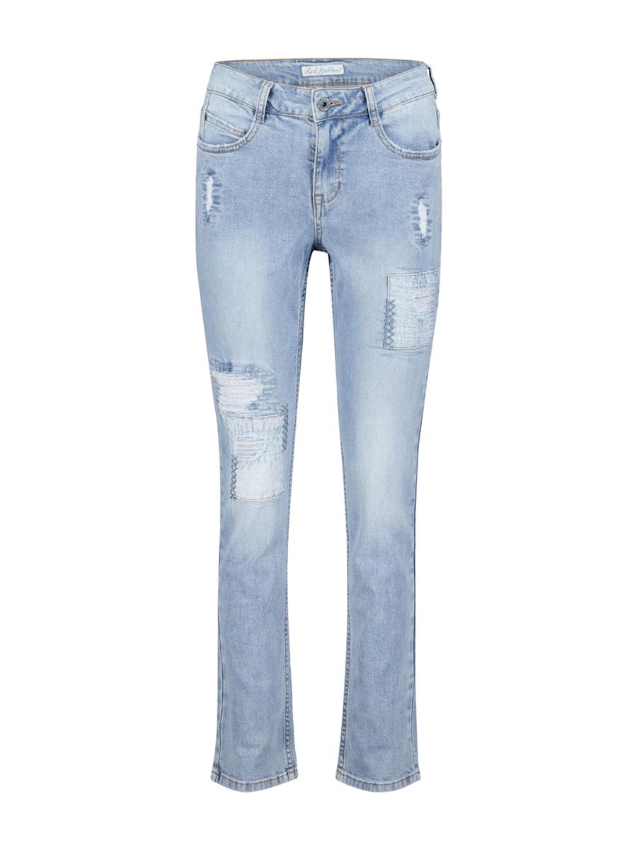 Super smart buks i lys denim med patchwork og slideffekt fra Red Button. Det slidte look giver en lækker kant til dit outfit og kan sammensættes på mange måder. Buksen har en god pasform og der er knap og lynlås. De er meget behagelige at have på.Kvalitet: 99% Bomuld - 1% Elastan